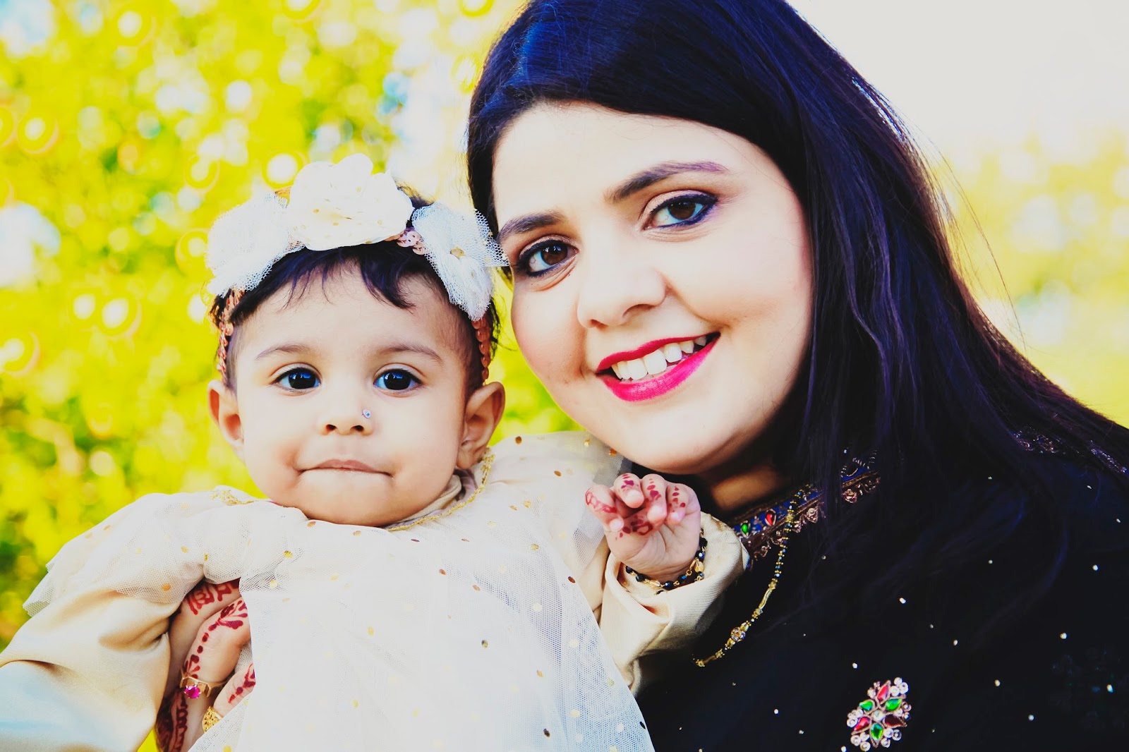 People often have a desire to wear a Sari, but find the prospective idea daunting! Clever pleating and pinning makes sure that everything is secure, movement in the garment, easy; and gives one the freedom to drape it in a modest way. Hand crafted beadwork and careful attention to detail makes eastern garments truly exquisite and pleasing on the eye. The combination of classic black with subtle hints of red and turquoise; and the intricate zari beadwork, makes this particular sari a timeless piece! Once again, Moon shows us that having a baby doesn’t mean we have to give up on looking stylish. She even makes glamorous look fabulous with a baby on the arm!