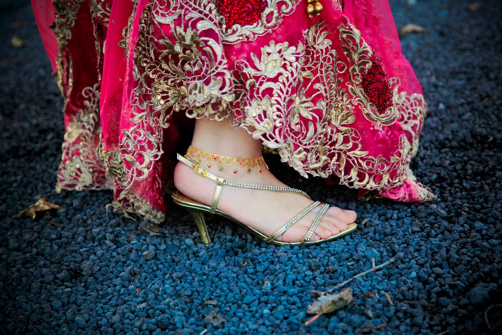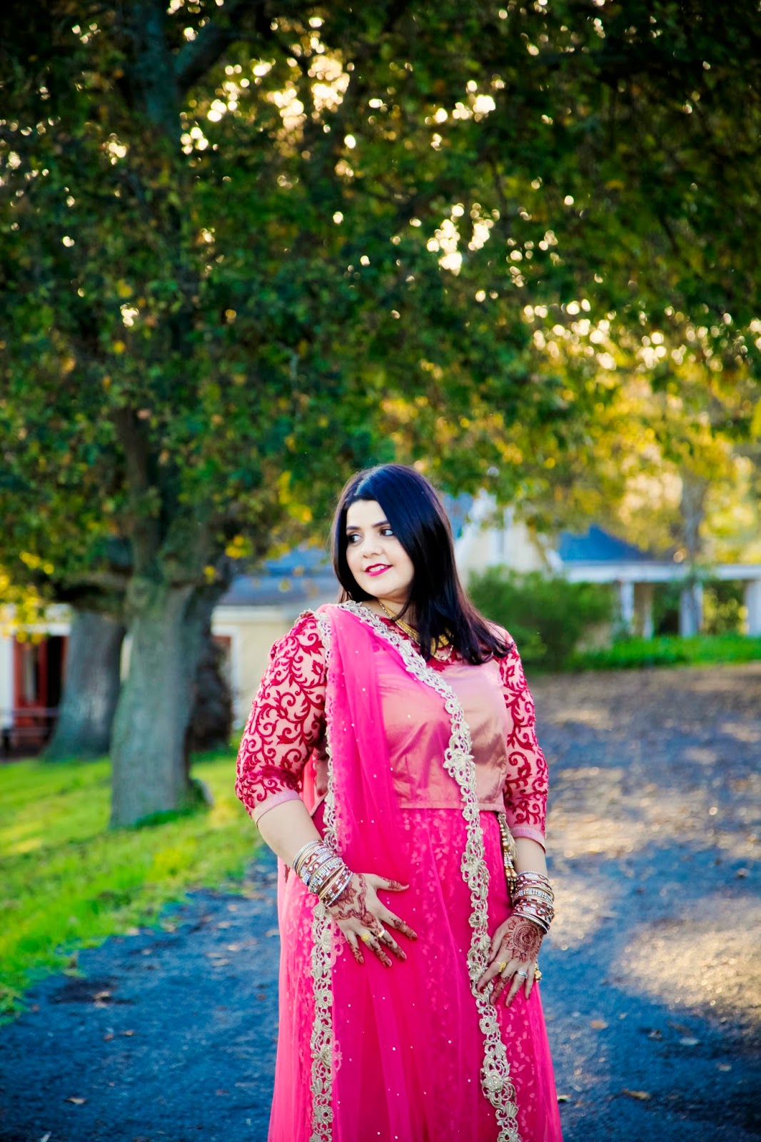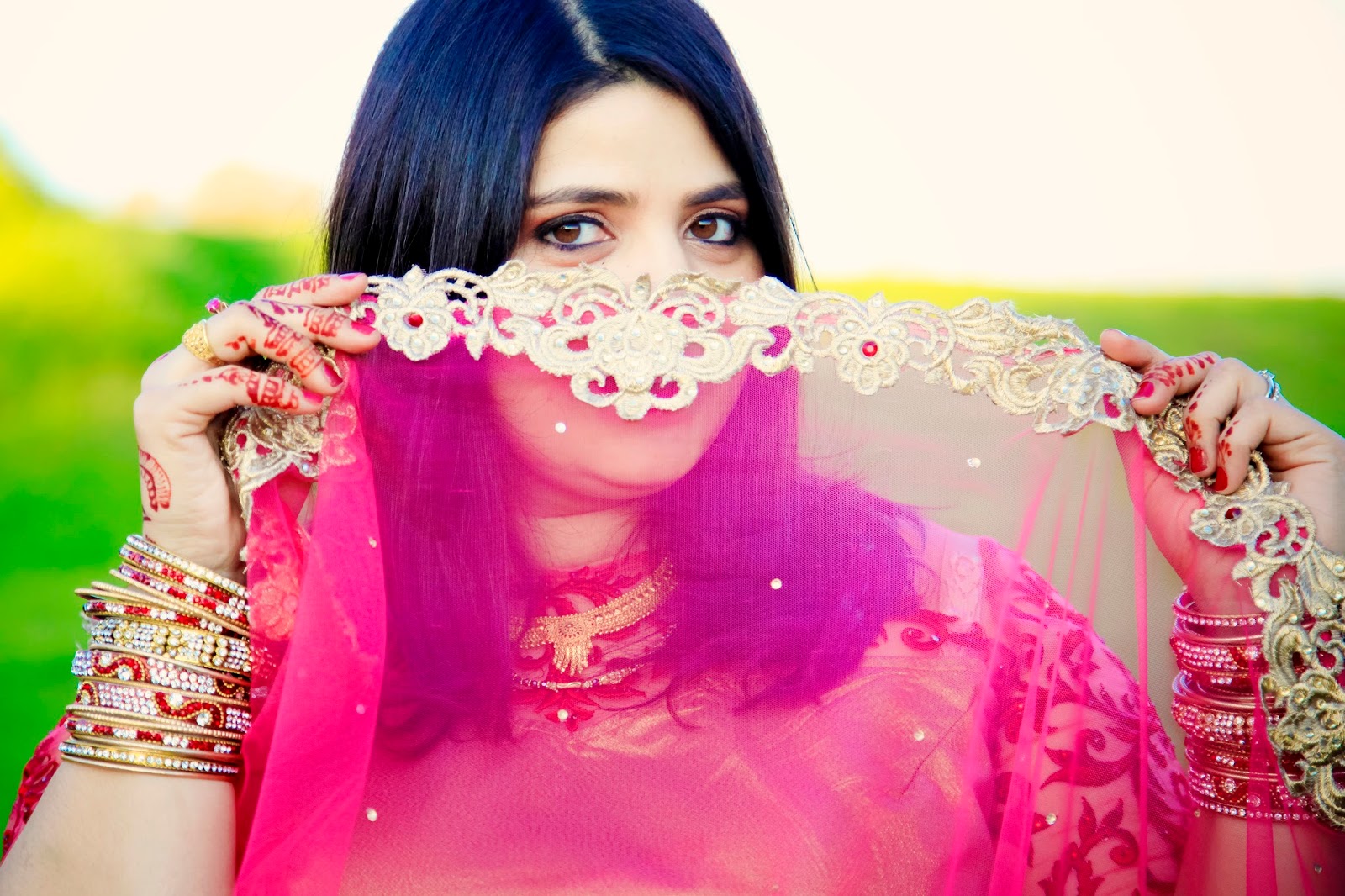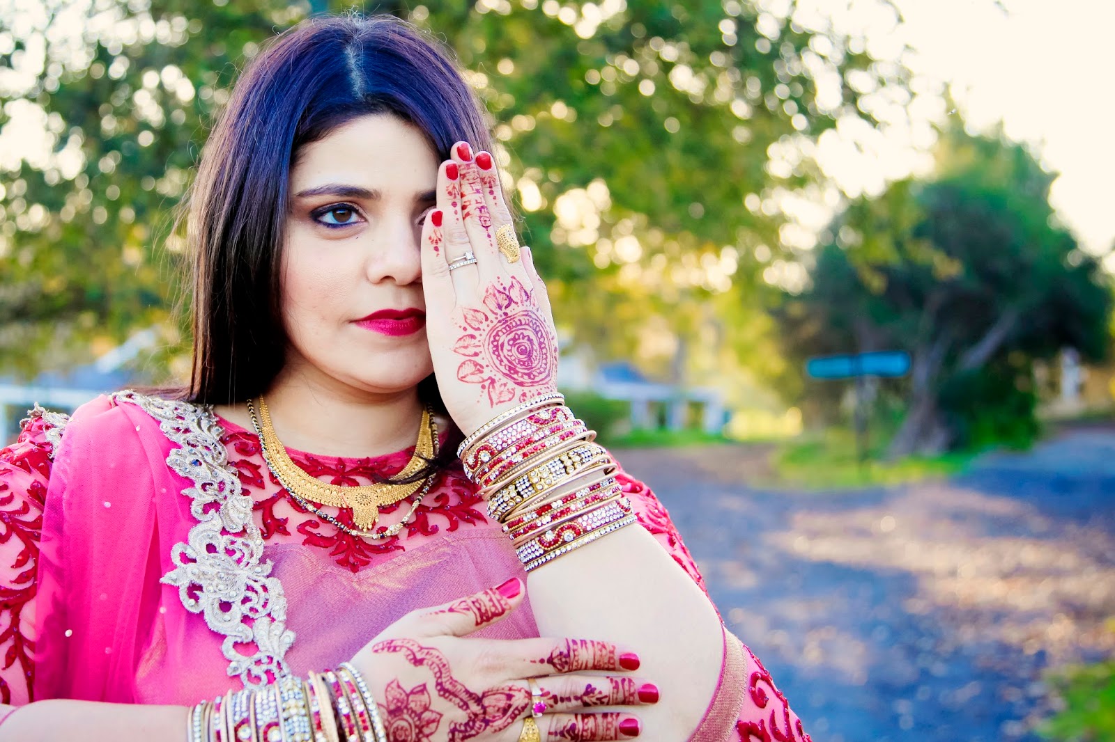 About this look: Moon’s Lehenga shows us the perfect balance of old and new with a very modern take on an Indian classic. The skirt is made up of a layer of rich, gold lace which shows beautifully through the top layer of cerise netting. The hem of the skirt and the matching cerise scarf’s border is covered in a combination beautiful intricate Indian embroidery and beadwork. The top is made in a contrasting colour and fabric, which is enhanced further by a richly embroidered neckline and sleeve in red. Mehndi patterns on the hands and classic Indian jewels; necklace, earrings and bangles completes this very modernised Indian look.